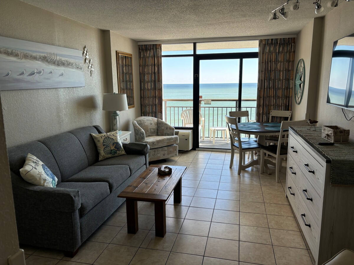Este ático extremadamente encantador ubicado en el corazón de Myrtle Beach cuenta con una amplia sala de estar, un enorme balcón desde donde se pueden ver kilómetros de playa de arena fina y el océano azul cristalino que desaparece en el horizonte, un dormitorio principal súper elegante, una cocina de primera categoría, un baño elegante con bañera de hidromasaje y una cómoda sala de estar con una cama Murphy plegable. Este popular apartamento privado recientemente renovado se lleva el primer premio por su lujo refrescante.