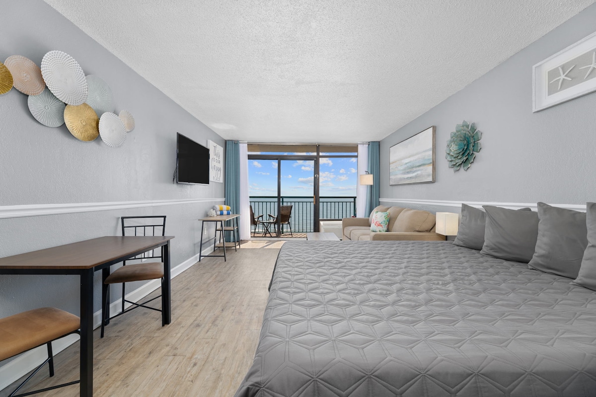 Este estudio frente a la playa en el séptimo piso ofrece una vista impresionante del océano. Desde el momento en que entras, tus ojos se sienten atraídos por el mar abierto, tranquilo, infinito y relajante. Tanto si buscas amaneceres, largos paseos por la playa o un lugar para recargar energías, este elegante apartamento ofrece todo lo que necesitas para una escapada perfecta junto a la playa. Una cama tamaño king con sábanas frescas ofrece un lugar cómodo para relajarse. ¡Pasa el rato en tu balcón privado, donde puedes ver las olas!