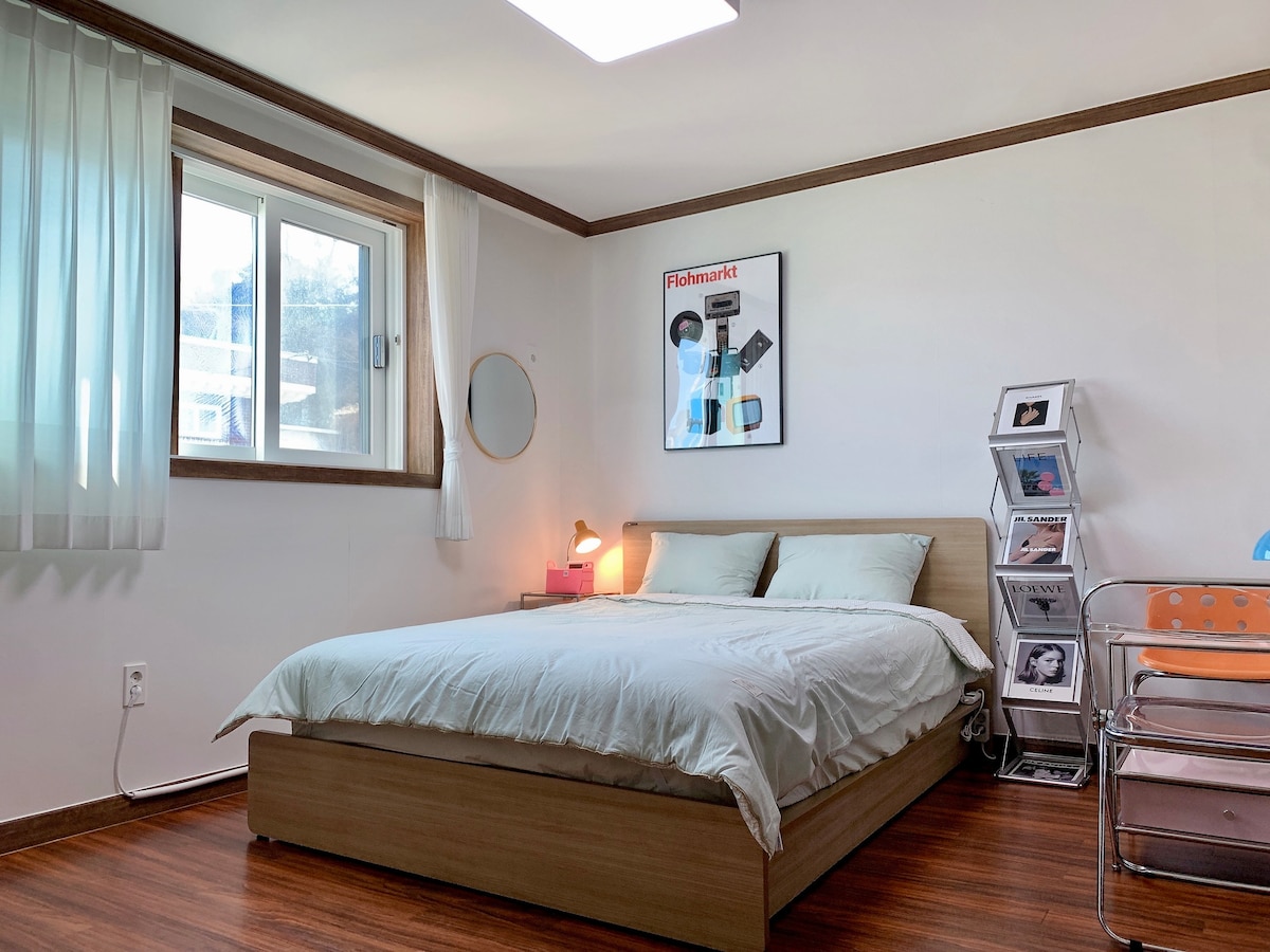 Es un anexo de una casa unifamiliar ubicada en una zona residencial unifamiliar tranquila. En el gran césped del patio hay 2 perritos pequeños y carpas en el estanque. Puede hacer una barbacoa en el césped y divertirse en el karaoke subterráneo (está equipado con aire acondicionado y calefacción). El paisaje de la mañana es muy bonito. Disfruta de la naturaleza en una mesa de jardín tranquila y pacífica con una taza de café. . . Varias flores siguen floreciendo y muriendo. El amplio campo detrás del edificio también es digno de ver, ya que el arroz cambia de verde a amarillo según la temporada ^ ^ * Check-in - 4 p. m. (el almacenamiento de equipaje está disponible desde la mañana) * Check-out - 12:00 * Barbacoa con fuego de carbón - 20 000 wones (incluso si llueve, es posible si el viento no es fuerte, y en invierno se enciende un calentador y una cortina cortavientos). * Karaoke subterráneo - Reglas de uso -Tarifa: 10,000 wones sin límite (nueva canción actualizada todos los días)/área para fumadores/bebidas alcohólicas, bebidas y alimentos no permitidos. * Ofrecemos un dispensador de agua, aire acondicionado, TV, cocina eléctrica, hervidor eléctrico, cafetera de granos, plancha, microondas, lavadora, tostadora, nevera, arrocera eléctrica, champú, acondicionador, gel de baño, toallas.