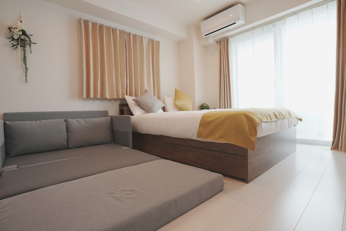 ◆Location: 1 subway stop from Namba, Dōtonbori, and Tennōji. 180m from Daikokucho subway, 2mins walk. ◆Facilities: Two double bedrooms Separate living area, kitchen, and bathroom. Fits up to 4 guests. ◆Transport: Access to Midosuji, Yotsubashi, JR Loop, and Nankai Line. Kansai Airport: 45 mins on Nankai Line, no transfers. Universal Studios: 25mins by JR. ◆Notes: 1 free towel/guest. Extras 200 yen. No cleaning during stay. Quiet after 10 pm. No smoking indoors.