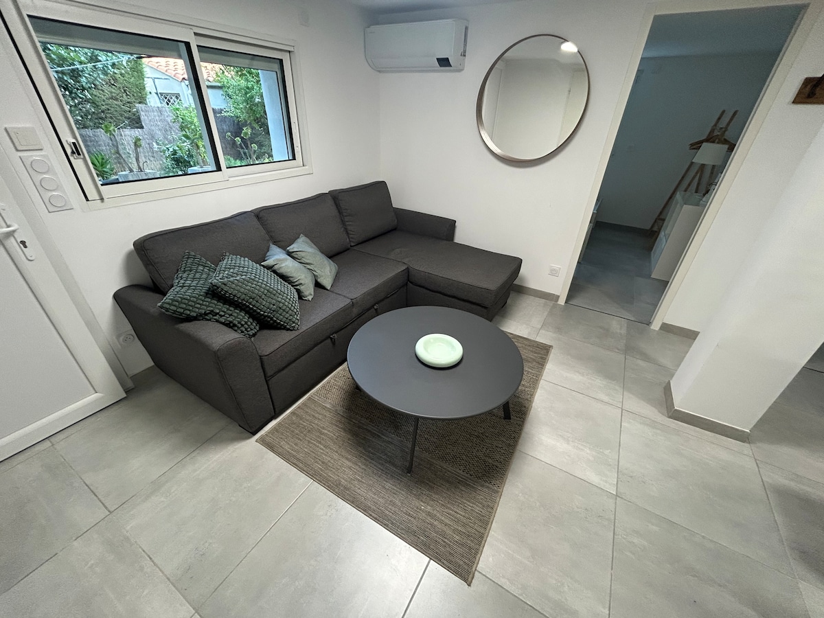 Este apartamento muy luminoso, restaurado, registrado en el Ayuntamiento . Vista panorámica del mar. Playa con bandera azul desde 1988. Acogedor apartamento, totalmente equipado ( cama 160x200), ocupación máxima 2 adultos, en el último piso de un pequeño edificio, cerca de tiendas, restaurantes. Ventilador de techo + enfriador de aire. Cobertizo de jardín con 2 bicicletas de montaña + juegos de playa. Aparcamiento público gratuito frente al edificio. Fibra wifi en el apartamento.