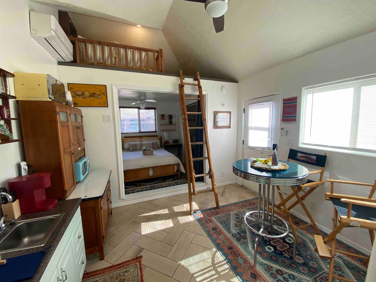 Acogedora y pequeña casa con un dormitorio y un loft, entrada privada y entrada para vehículos. Situado en el histórico barrio de Barelas de Albuquerque, a pocos pasos del zoológico y a poca distancia en coche o en bicicleta del casco antiguo, el río Grande y muchas cafeterías y restaurantes deliciosos del centro de la ciudad. El estudio está adosado a una propiedad más grande, pero tiene su propio patio trasero tranquilo que está vallado para la privacidad de los huéspedes. El estudio cuenta con decoración vintage y retro con un tema de Albuquerque.