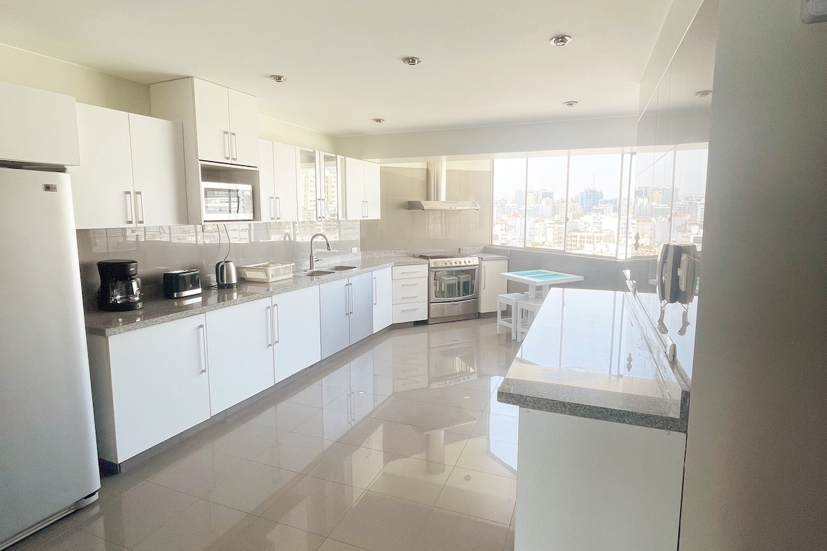 Nos enamoramos de este condominio en la cima del acantilado de Miraflores después de alojarnos en muchos Airbnbs en Lima. 200 m² en el piso 14 con vistas completas a la costa: mira a los surfistas y parapentistas en el Parque del Amor y disfruta de las puestas de sol sobre el Pacífico. 3 dormitorios (king + doble + 2 individuales), 3,5 baños incl. jacuzzi, cocina totalmente equipada + lavavajillas, lavandería, Wi-Fi rápido. Edificio seguro con portero 24/7, 2 ascensores, fácil registro de entrada. Camina hasta Larcomar, los parques del Malecón, la playa, los cafés y los mejores restaurantes.