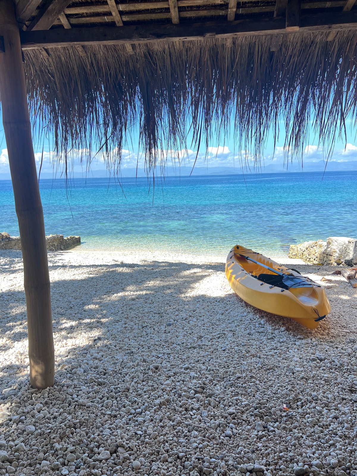Combinación de diseño de casa nativa y moderna, bien iluminada, ventilada y fresca. A 3 minutos a pie de una playa de arena gris limpia con arrecifes de coral de colores vivos. Sin embargo, tienes que usar zapatillas, ya que hay muchas rocas. Los ventiladores son lo suficientemente cómodos, ya que hay mucha brisa que viene del mar y la propiedad está rodeada de árboles y plantas. A unos 25 minutos de la ciudad en jeepney o triciclo.