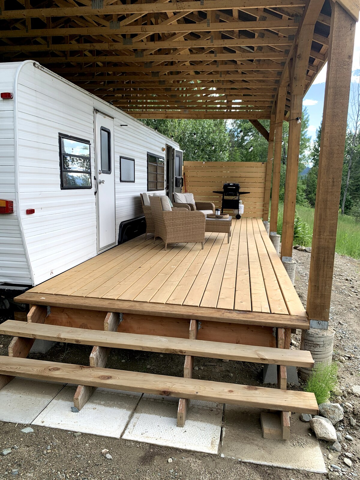 ¡Perfecto para una escapada! Luminoso, cálido y acogedor, nuevo 5to remolque de cuatro estaciones enclavado en las montañas. Este espacio se encuentra en una ubicación privada y cuenta con cocina completa, cocina al aire libre con bar, baño con ducha, calentador de propano, televisores de 40 pulgadas, Netflix, wifi, chimenea eléctrica, cochera cubierta y una gran terraza. También encontrarás una bañera de hidromasaje de leña hecha a medida a pocos pasos de la puerta. El centro de Nelson está a 5 minutos en coche y a 20 minutos de la estación de esquí Whitewater.