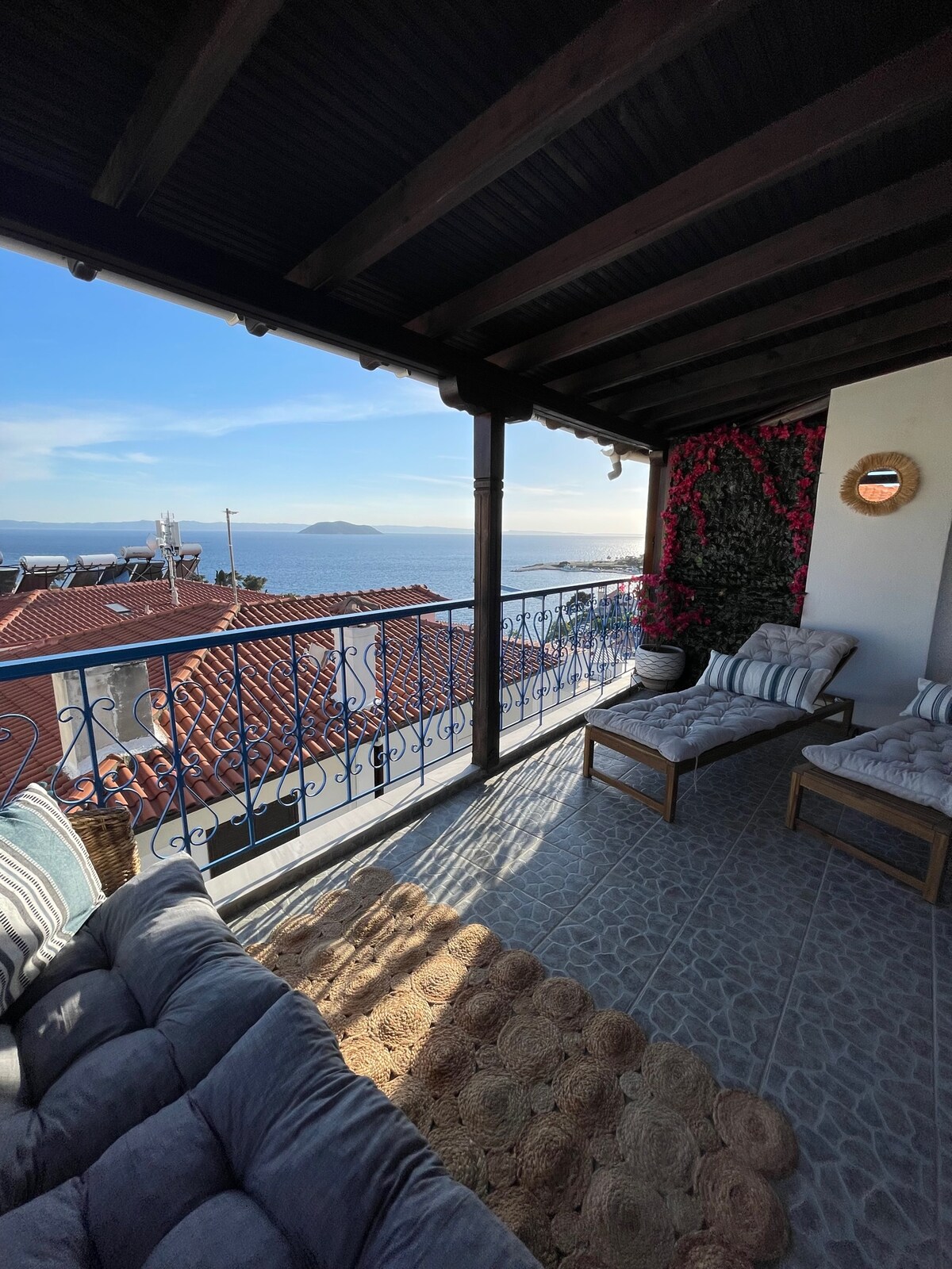 Escápate al encantador pueblo de Pyrgadikia, donde te espera Bellevue – ático con vistas panorámicas al mar. Ubicado en la pintoresca bahía de Sitonia en Calcídica, nuestro ático vacacional está diseñado para aprovechar al máximo las hermosas vistas, con grandes ventanales y puertas de vidrio que se abren a tres balcones que ofrecen vistas panorámicas del mar Egeo y la montaña sagrada de Athos.