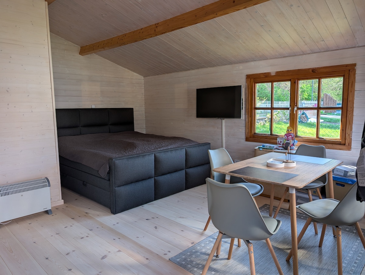 Ofrecemos una casa de vacaciones en el Templiner Stadtsee (vía navegable federal) con un embarcadero. Tiene una zona de descanso con una cama doble de 2 m, así como una sala de estar independiente con un sofá cama para 2 personas. Hay una cocina con lavavajillas, horno y nevera. El baño está equipado con ducha. Una amplia terraza te invita a quedarte. Hay muchas plazas de aparcamiento. El embarcadero está situado en el lago de la ciudad, debajo de la casa de vacaciones, y es adecuado para pescar.