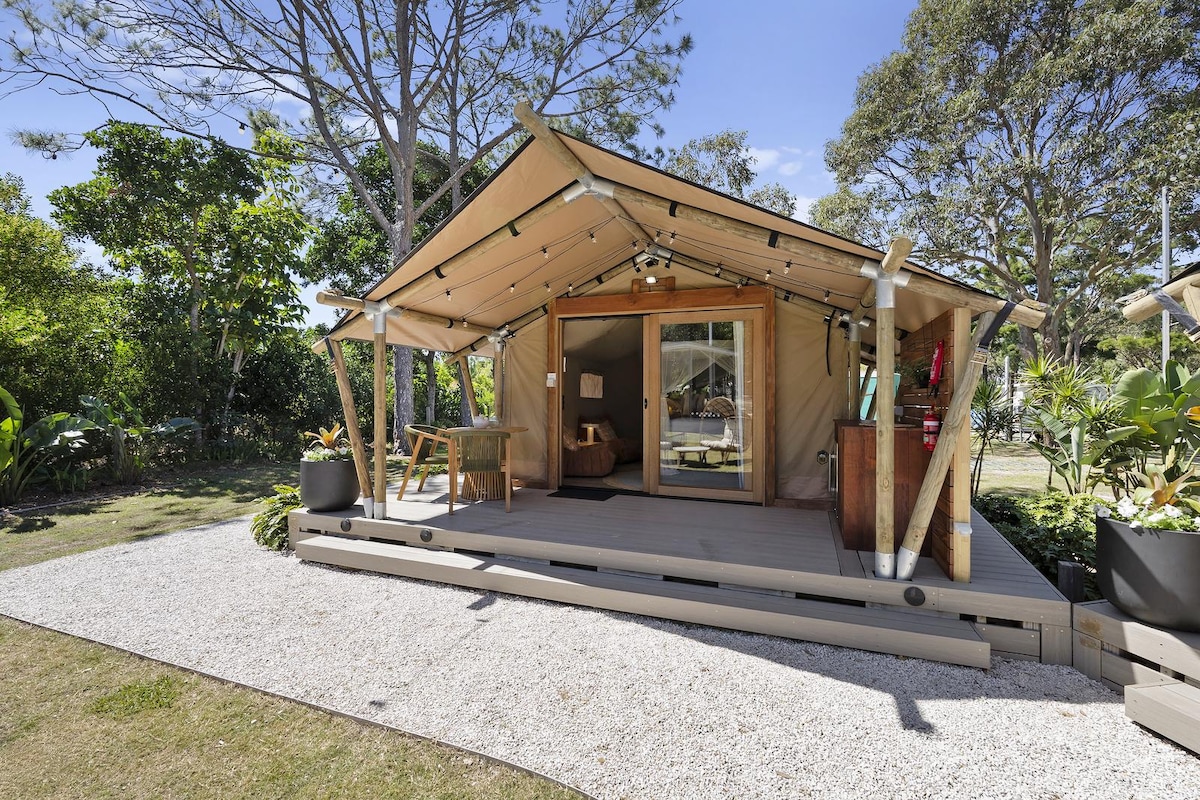 Glamping Bush Belle Relájate entre los árboles de mango mirando hacia el océano, es hora de desconectar. Disfruta de todas las comodidades de la tienda Belle con su cama tamaño queen, ropa de cama de lujo y baño independiente (se proporciona toda la ropa de cama). Al caer la noche, relájate bajo las estrellas con un vino tinto. Los hermosos jardines ofrecen mucha observación de aves. ¡Es un paraíso para los amantes de las aves! Tu perro también es bienvenido, hay mucho césped para correr. La propiedad está a solo 10 minutos de Ballina en una finca de campo. Ven a alojarte, relájate y disfruta.