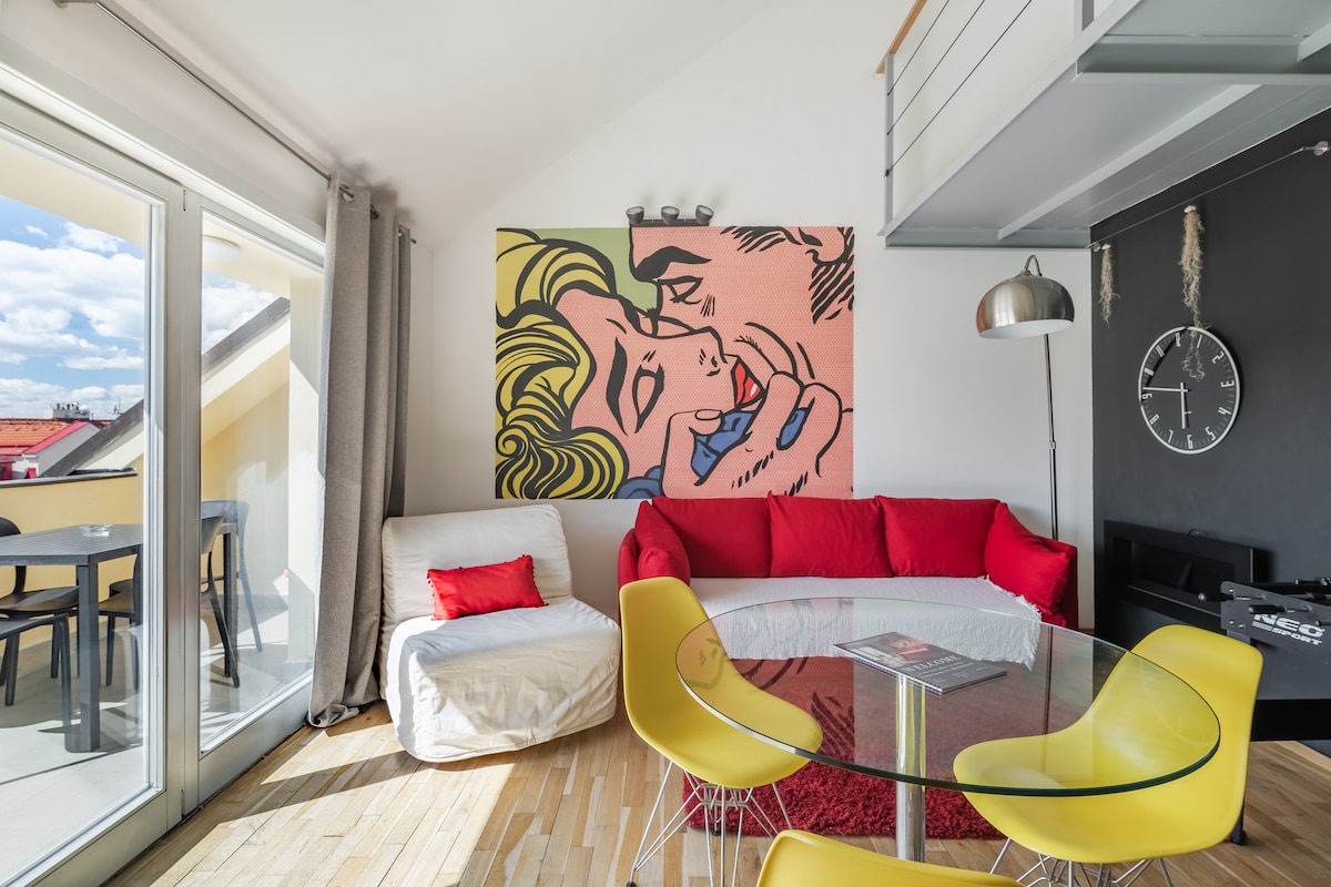 ¡Entra y alójate en nuestro apartamento en la azotea con balcón, ascensor y cocina totalmente equipada! El estudio cuenta con un acogedor balcón, TV inteligente con Netflix, cama tamaño queen y cocina nueva. ¡El barrio está rodeado de lugares de interés gastronómico y los principales lugares de interés están a poca distancia a pie! No solo te proporcionamos el apartamento, sino también guías útiles que hemos creado para ti. Nunca te perderás ni pasarás hambre. ¡Puedes contar con nosotros!