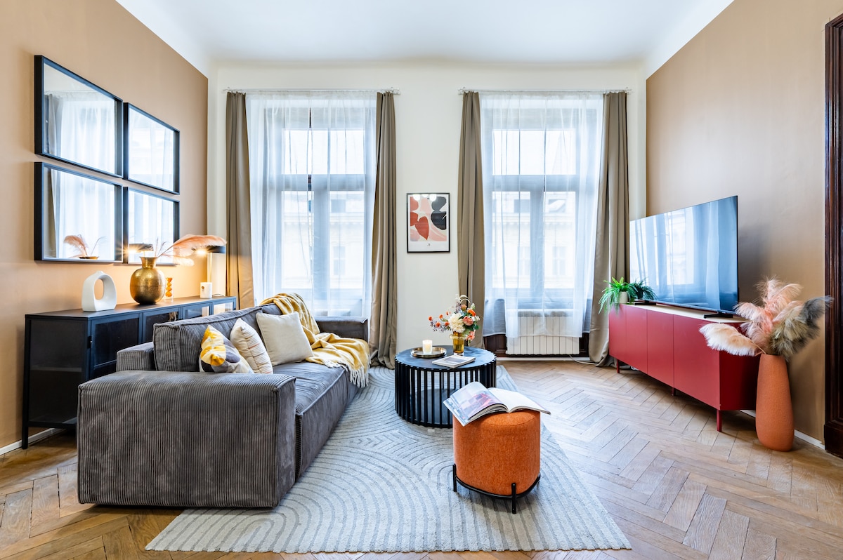 Experimenta los nuevos y elegantes apartamentos totalmente amueblados diseñados por el famoso estudio arquitectónico Nedvěd Architekti, donde puedes encontrar de todo, desde camas cómodas hasta toallas y tazas de café. El edificio cuidadosamente renovado ha conservado lo mejor de la historia y ha agregado todo lo que la vivienda moderna requiere. ¡Ponte cómodo! • A 5 minutos del corazón de Praga • A 80 metros de la cafetería más cercana. • A 1 parada de la estación de tren principal. • A pocos pasos del metro y el tranvía.