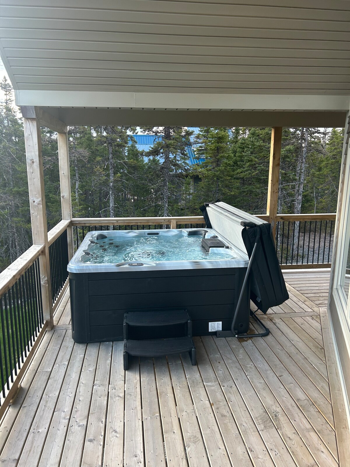Ubicado en el hermoso Southeast Arm, este moderno y espacioso chalet de 2 dormitorios es la opción perfecta para una escapada en pareja, unos días visitando nuestra ciudad histórica, una noche antes de embarcarse en el ferry de Argentia o si simplemente necesitas descansar mientras los niños practican deportes. Ubicado en el bosque, es difícil imaginar que estás a 1 minuto de la carretera principal. Es imposible no encontrar la paz aquí. En verano, la piscina a nivel del suelo es un verdadero placer. Disfruta de las vistas desde arriba. La piscina cierra a finales de septiembre.