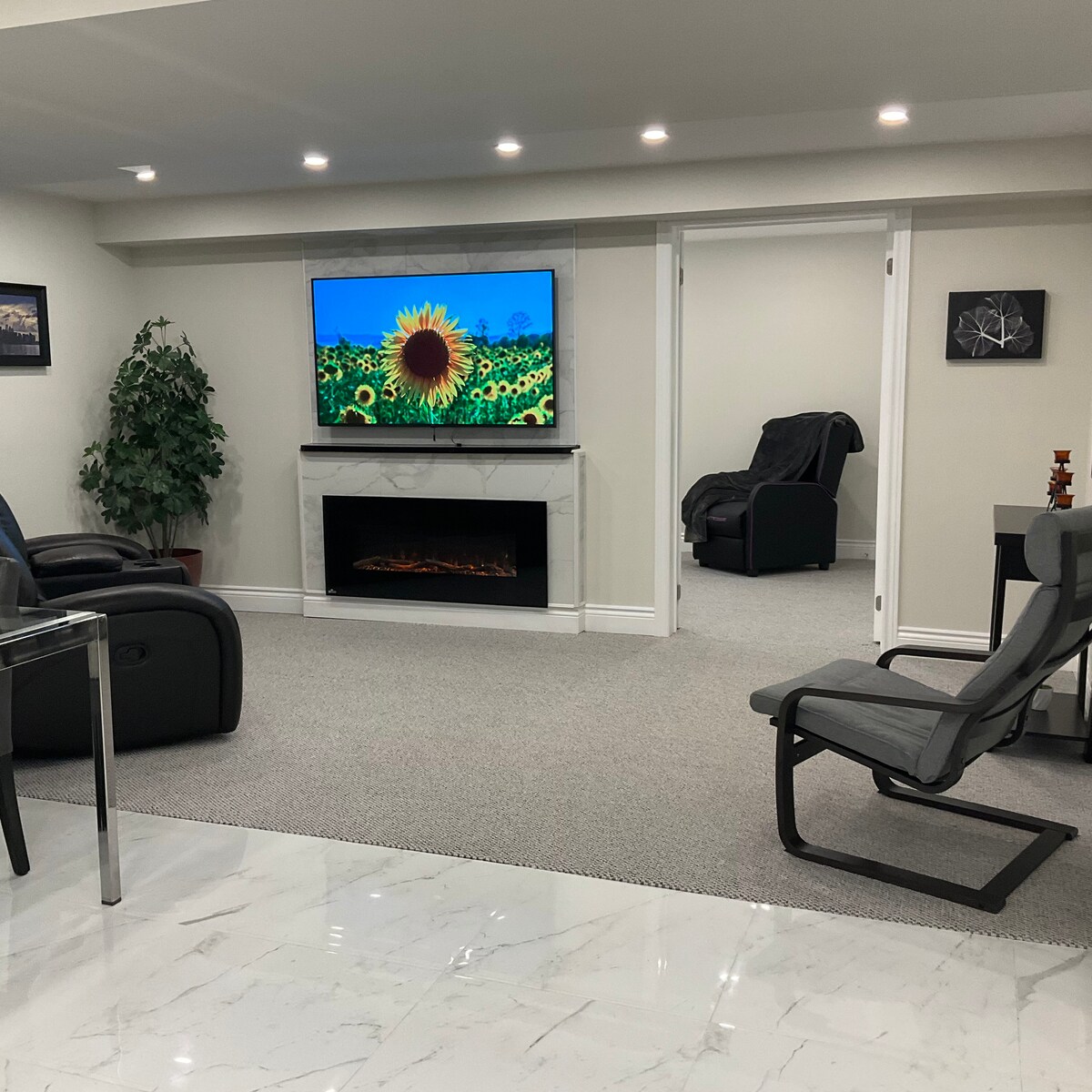 Disfruta de fácil acceso a tiendas, restaurantes y entretenimiento desde esta ubicación perfecta. A solo 5 minutos en coche de la terminal de trenes y autobuses GO, con transporte rápido y cómodo al centro de Toronto, al parque temático Canada's Wonderland, etc. Esta suite de invitados de nivel inferior está totalmente equipada con lavandería propia, cocina americana con mininevera, cocina de inducción de 2 quemadores, microondas, tostadora y cafetera. Acogedora chimenea, TV HD de pantalla de 60 pulgadas y lujosa cama tamaño king. Barrio seguro con senderos para caminar y parques.