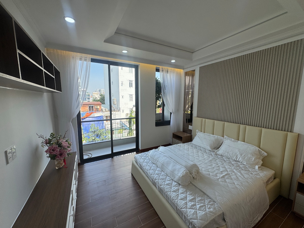 Situado junto al distrito de negocios de Phú Mư Hưng, área "nunca duerme" y a poca distancia a pie de la zona de catering de comida callejera donde puedes trabajar durante el día y disfrutar de la cocina vietnamita e internacional durante la noche en restaurantes baratos que ofrecen tus exigentes gustos. Precio: 19 USD/ persona/ noche para toda la casa de aparcamiento gratuito de 6 dormitorios y 3 plantas: (mínimo 3 huéspedes) a. 1-2 huéspedes: 38 USD por noche (19 USD por persona) b. 3-6 huéspedes: 57 USD/ máximo 6 personas/ noche (del 4 al 6 será el nuestro).