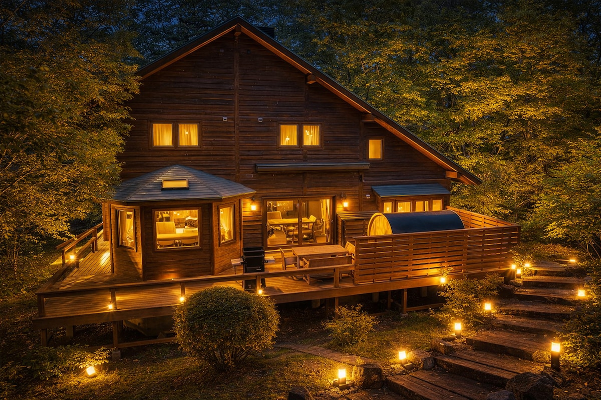 群馬・桐生の静かな山あいにある、森に囲まれた貸切ログハウス。 「ログベース黒保根の丘」は、自然と心地よい距離感でつながれる、小さなベースキャンプです。 ここでは、火を囲んで過ごす夜、テントサウナで心身をととのえる時間、ウッドデッキで楽しむBBQ、薪ストーブを囲んでの会話、プレイルームでの映画鑑賞、天体望遠鏡で星空観測など日常を離れたひとときをお楽しみいただけます。 【主な魅力】 🔥 火を囲んでくつろぐ:薪ストーブ・焚き火台を囲んで静かに流れる時間 (薪ストーブ11月頃~4月頃まで、焚き火4月頃~9月頃まで) 🧖 本格テントサウナ体験:自然に囲まれながらととのう、水風呂も有 🍖 BBQ可能な広いウッドデッキ:自然に囲まれた開放的な空間 🎮 プレイルーム完備:大型テレビ+JBL BAR800による臨場感ある映画・ゲーム体験 🪵 ログハウス完全貸切:ファミリー・グループや研修利用にも最適!最大8名まで宿泊OK 🍁 季節の移り変わり:夏は深緑、秋は紅葉に染まり、冬は夜空に満天の星が輝きます 「ログベース黒保根の丘」で、心ほどける休日をお過ごしください。