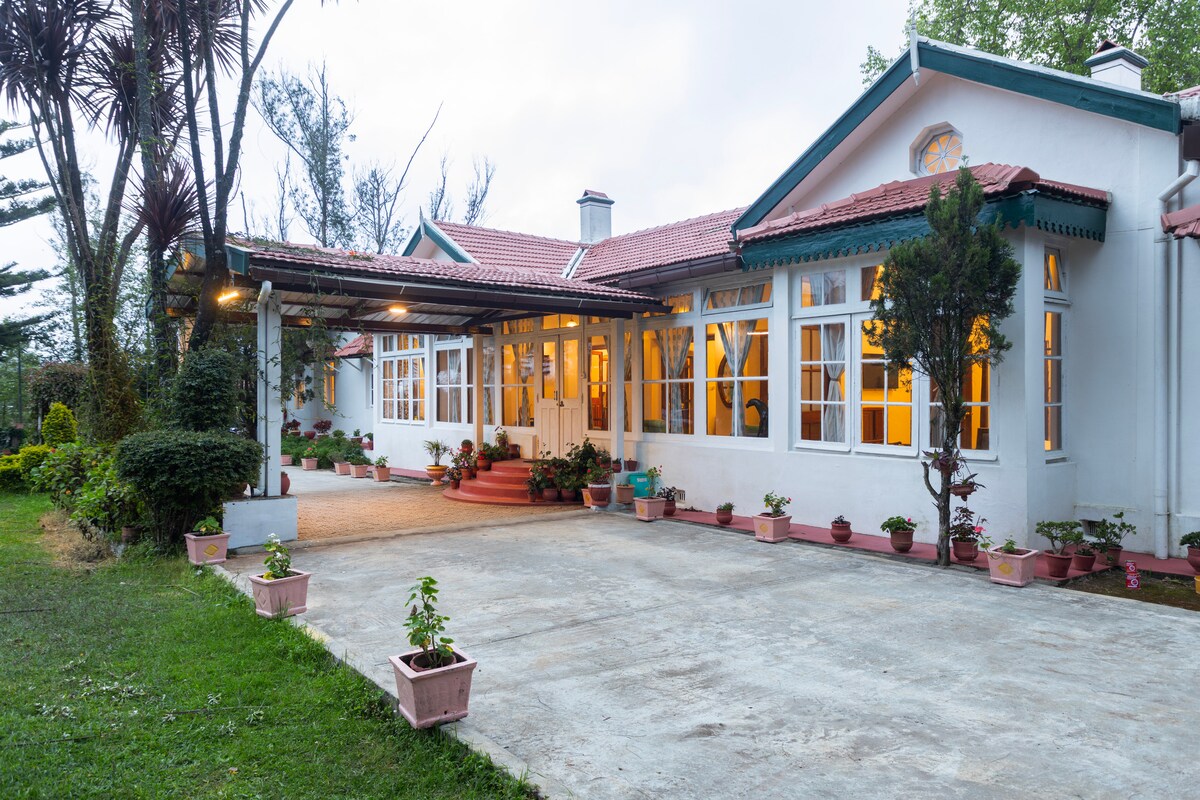 Para un alojamiento vacacional acogedor, no busques más allá de esta pintoresca casa de campo patrimonio, que combina el encanto anticuado con las comodidades contemporáneas. Con una conexión de fibra óptica de 100 Mbps, puedes admirar las impresionantes vistas panorámicas del valle de Ooty. A los niños les encantará jugar en los jardines privados. A medida que se pone el sol, disfruta del panorama de las brillantes luces nocturnas. Este nicho aislado es accesible y admite mascotas, por lo que es perfecta para personas mayores. Estacionamiento amplio disponible