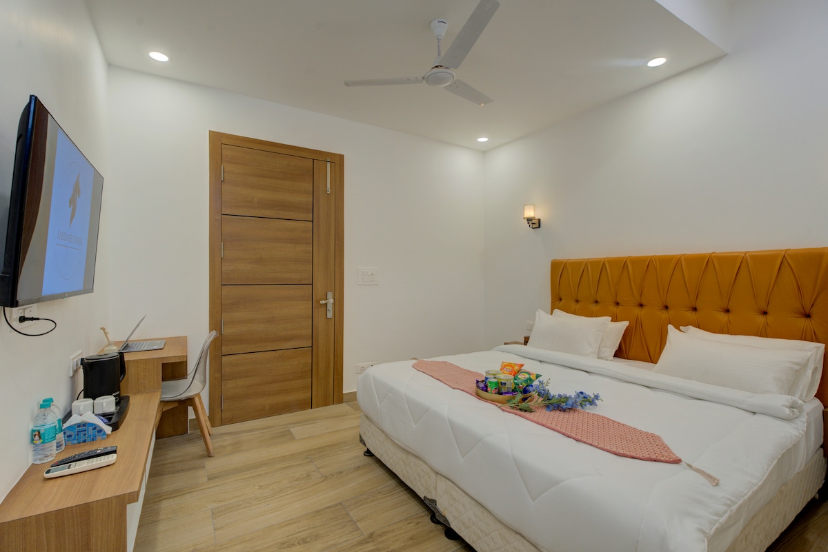 Disfruta de una estancia que combine un diseño moderno con una comodidad acogedora en Sandane Homes. Esta habitación de diseño ofrece interiores elegantes y servicios cuidados, perfectos para una escapada elegante pero relajante en Greater Noida.