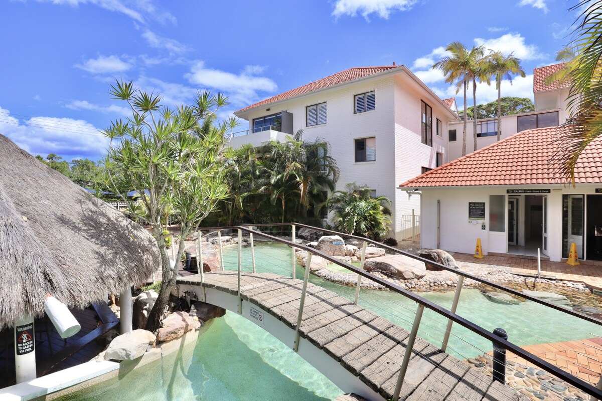 Estudio fresco, luminoso y vacacional con vistas a las 3 piscinas de la laguna más grandes de Noosa. Ubicado en el hermoso río de Noosa. Una ubicación ideal, justo enfrente del puerto deportivo/ferry de Noosa, a poca distancia en coche de Hastings Street/Noosa Main Beach/Noosa Heads (10 minutos). Parada de autobús al frente del complejo. Relájate en tu terraza o en el espacio de los jardines tropicales y las piscinas del centro vacacional, después de un día de exploración. Champán y pan fresco complementarios. Perfecto para 1 pareja o viajeros solteros.