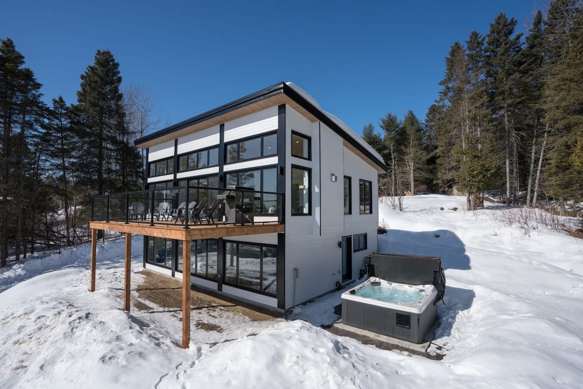★ One of the most unique chalets in Mont-Tremblant★ Unique & Secluded all White Glass Treehouse with Breathtaking Mont-Tremblant mountains views! The cabin is majestically glazed architectural space combining natural simplicity and contemporary luxury, 10 min from village of Mont-Tremblant, Ski Tremblant. Nestled on the end of the cliff with a fully glazed living space, Bathtub with view, The Panoramic terrace & Private hot tub for an unparalleled relaxation experience. Canadian Designer.