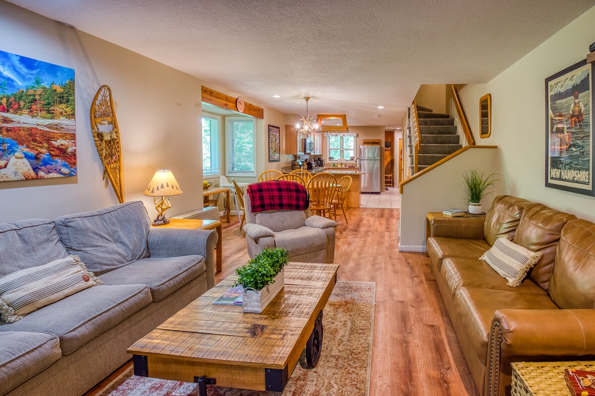Bienvenido a nuestra escapada de montaña en nuestro condominio Glen, NH, a pocos minutos de Attitash, Wildcat y Cranmore para esquiar, ¡con Storyland a solo una milla de distancia! Relájate en la acogedora y espaciosa sala de estar con lujosos asientos y una chimenea, perfecta después de un día en las pistas o visitando a Santa. Disfruta de las vistas a la montaña en temporada desde la cocina y el salón. La cocina moderna, equipada con electrodomésticos nuevos y amplios suministros, hace que las comidas caseras sean muy fáciles.