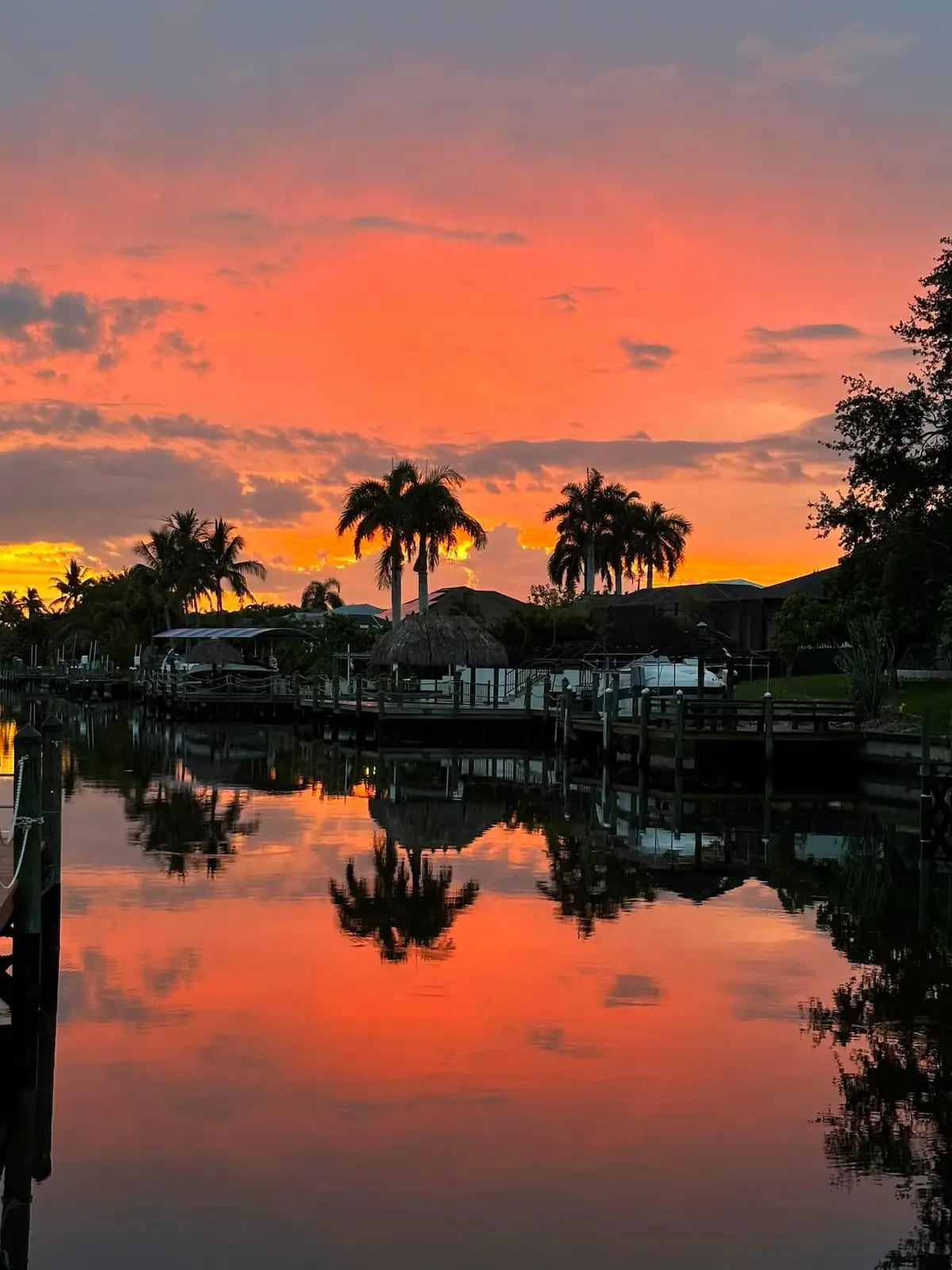 Renovated lanai! This 3 bed/4 bath home is on the nicest canal with 200+ ft of frontage & gorgeous views of the canal & sunset. The pool, tiki hut & docks have full sun all day. Each bedroom has a private bath & there's a 2 pc powder room off the laundry. The primary has a king bed & walkout to pool. The 2nd bedroom has a queen bed & pool access. Bedroom 3 has a queen & private bath. Fully equipped kitchen with everything you need. And a games room! Enjoy stunning sunsets under the tiki hut.