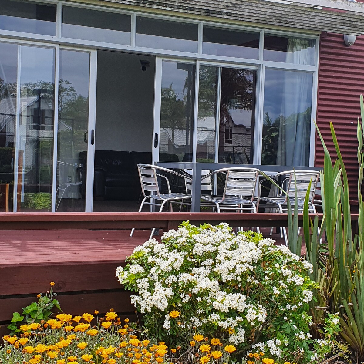 Nuevo estudio independiente con zona de terraza cubierta, que se abre a un jardín soleado totalmente vallado, privado de los vecinos. A pocos pasos de Main Beach, del estuario y del campo de golf de nueve hoyos. Whangamata es adecuado para todos los deportes acuáticos, caminar, hacer senderismo, montar en bicicleta, etc. Nuestro municipio alberga tiendas en general, cafeterías y restaurantes.