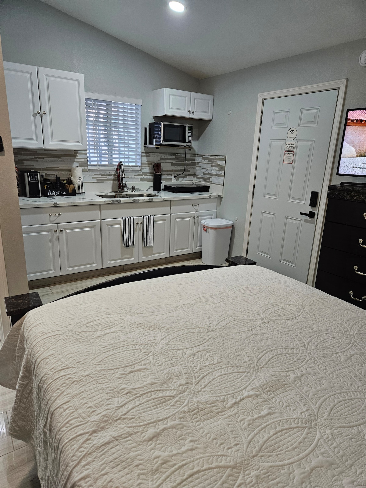 Relájate en nuestro encantador refugio. Descansa en una cómoda cama king-size, crea delicias culinarias en la cocina totalmente equipada, y disfruta de un baño moderno con lavadora/secadora. Aprovecha ventajas como estacionamiento gratuito, TV con streaming y WiFi de alta velocidad. Tu escapada perfecta te espera en esta ubicación privilegiada, donde la comodidad se encuentra con la emoción urbana. Bienvenido a un oasis de confort y estilo, diseñado para tu relajación y disfrute.