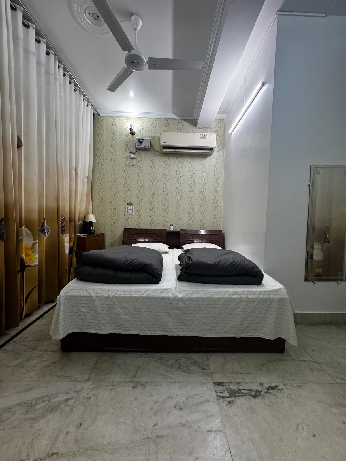 Welcome to your cozy private room in Mahavir Enclave, perfect for solo travellers, working professionals, or two guests such as married couples, siblings, or cousins. (Please note: we do not host unmarried couples.) This room is a family home but offers complete privacy, with your own: ✔ Queen bed with fresh linen ✔ Private attached bathroom ✔ Private balcony ✔ High-speed Wi-Fi ✔ Lift access ✔ Free parking for Hatchback car & bikes ✔ CCTV security in outside areas ✔ Smart TV ❌No Kitchen