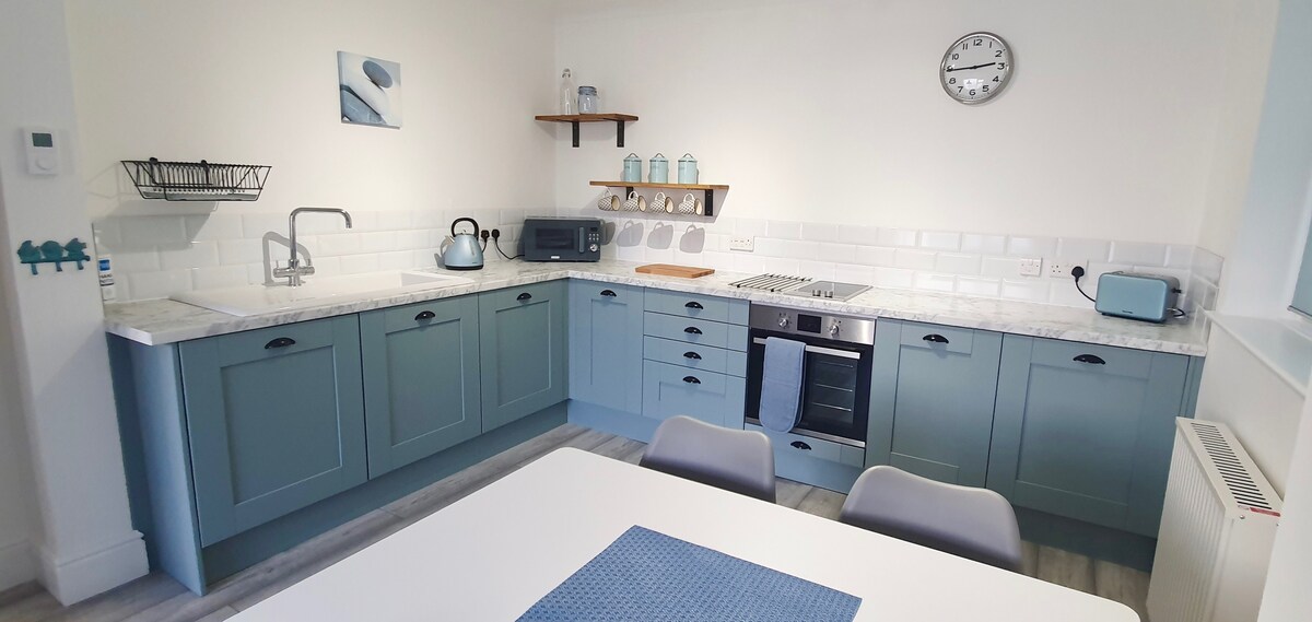 Ocean Wave is a beautiful ground floor apartment with far-reaching sea views, in the seaside town of Westward Ho! Just a 5 minute walk to the beach, pubs & cafes, along with easy access to the South West Coast Path. Private parking space for one car. Two bedrooms, one with a king-size bed, en-suite and sea views, the other a twin, with separate bathroom. The living room has stunning sea views, as well as a smart TV. Fast wi-fi throughout. The kitchen diner is well equipped.