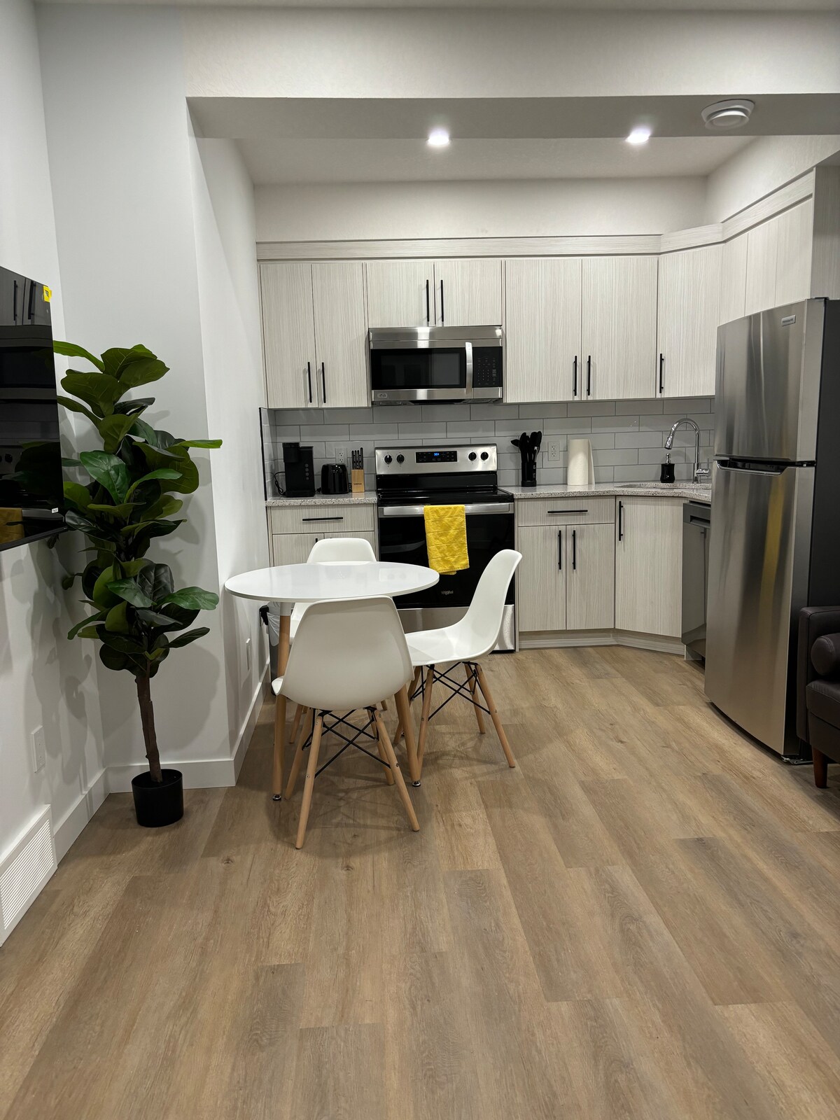 Welcome to the Blueberry Suite, a bright and comfortable legal basement suite with a private side entrance. Enjoy the entire lower level featuring a king size bedroom with a cozy mattress, fully equipped kitchen and dining area, full bathroom with tub & shower. In-suite washer and dryer. Located in Livingston NW, just 15 minutes from YYC Airport, 10 minutes from CrossIron Mills Mall, and within easy driving distance to Banff National Park and Kananaskis.