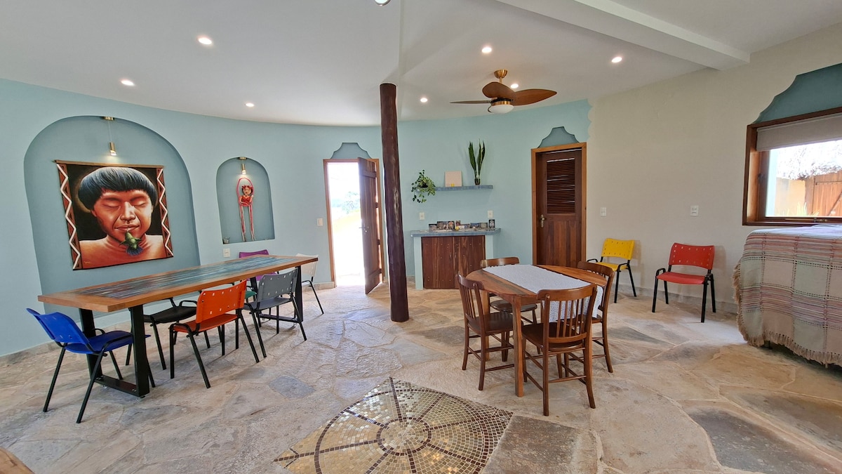 Casa bioconstruída com espacos amplos, sala com cozinha bem ventilados! Acomoda familias de até 4 pessoas, 1 casal com 2 crianças ( 1 cama de casal, 1 de solteiro e 1 beliche)! Se localiza na Vila das Flores em Serra Grande a 6 minutos a pé da praça e 1 minuto de carro...Fica a 1,5 km da Praia do Pé de Serra e 7 km do Rio Tijuipe. Local perfeito pra passar o verão na Bahia