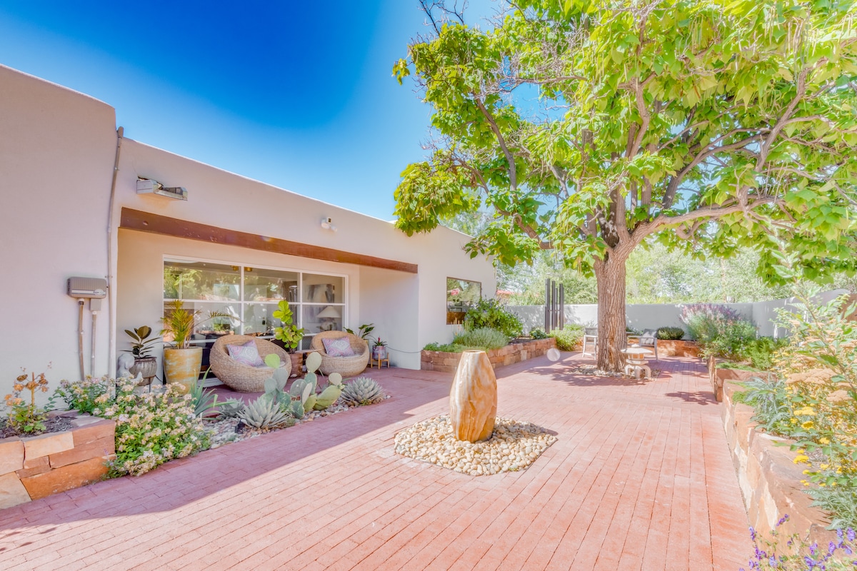 🌜H I D E A W A Y N O R T E: an inspiring & cozy adobe for your high desert adventure 🌵EASY 3 MINUTE WALK to Santa Fe's best restaurants, bars, coffee shops, boutiques, movie theaters, farmers and artisan markets. 🌵Train direct from ABQ + skip the rental car 🌵King + Queen beds 🌵Fast ⚡️ WIFI 🌵Fireplace + AC/heat minisplits 🌵Bonus Sunroom w/couch and TV 🌵Private patio 🌵Full Laundry 🌵KIDS: Pack n’ Play, high chair/booster, toys, books, white noise 🌵DOGS: beds, bowls, gated patio