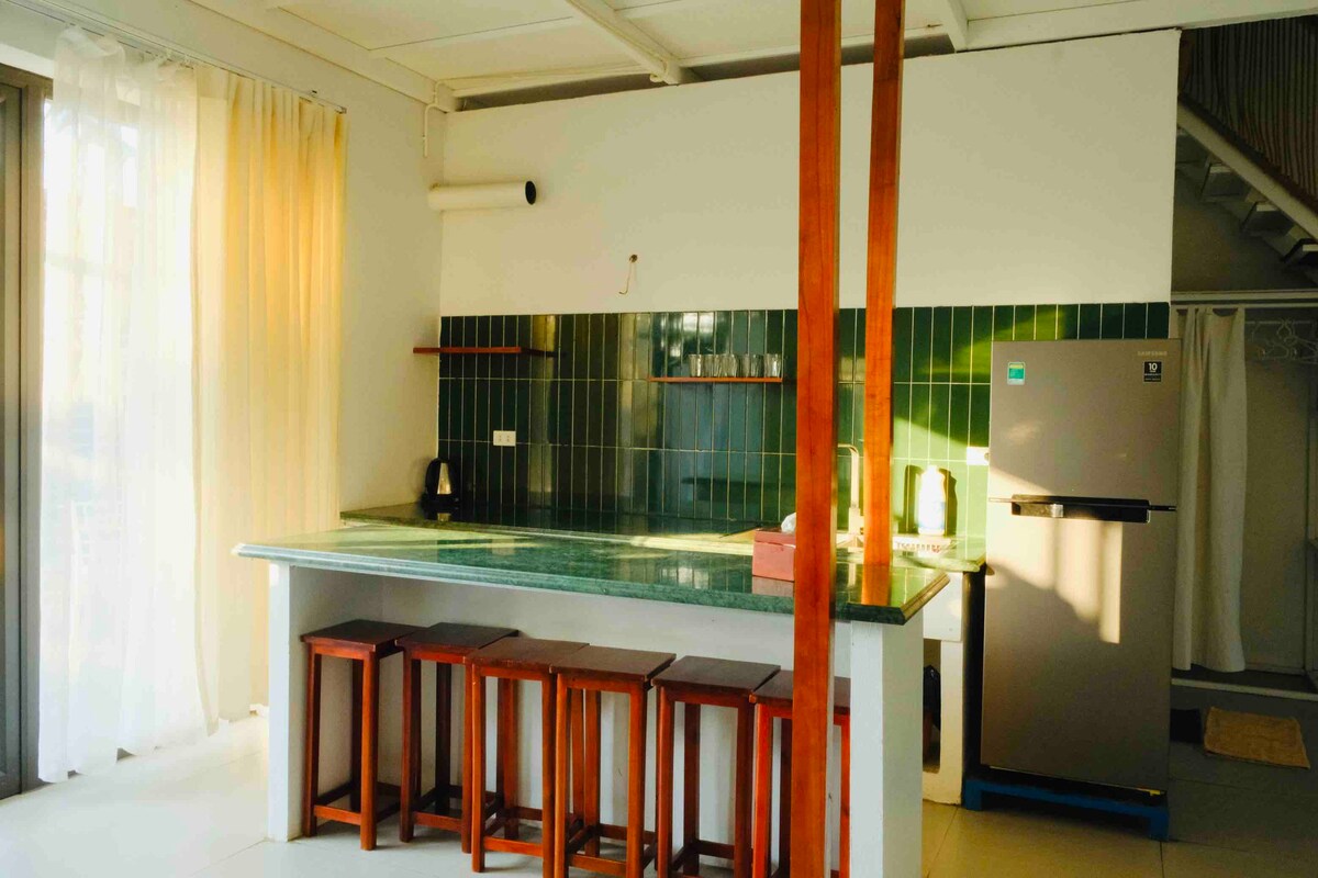 Casa de campo única en la ciudad que te ofrece una casa privada con 2 dormitorios y una sala de estar equipada con una cama individual, cocina, patio y grandes jardines con muchos tipos de árboles frutales tropicales. Ubicada en la cima de una pequeña colina y en una pequeña aldea tranquila, la casa te traerá un ambiente local auténtico con vecinos amables junto con la privacidad y la tranquilidad. - A 5 minutos a pie de la playa más cercana, Cai Beo. - A 10 minutos a pie del centro de la ciudad. - A 3 minutos en auto del muelle de Beo. - A 6 minutos en auto de Canonfort.