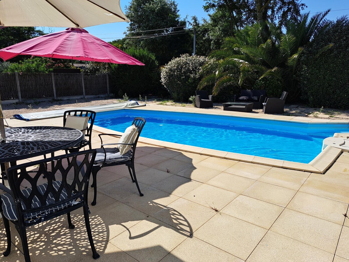 Cerca de Noirmoutier / isla de Yeu Tranquila villa con piscina privada, climatizada por una bomba de calor regulada por la temperatura exterior.(Si tiene alguna pregunta, ¡no lo dude!😊). - 500 m de bosque - 1,5 km de playa: a pie, carril bici, coche Inicio 6A / 1BB / 1 niño 2/5 años - 2 habitaciones con su SB - 1 dormitorio y cuarto de baño: bañera, equipo de bebé + cama - Gran sala de estar y biblioteca / juegos - Cocina equipada - Cabaña: barbacoa + salón; rincón privilegiado para los viajeros😄 - Terreno +juego de bolas