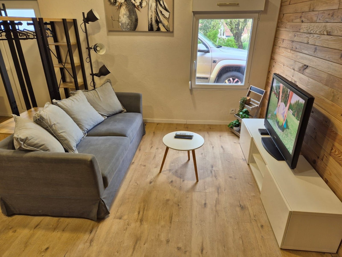 Venga a descubrir este cálido estudio situado entre Belfort y Montbéliard y cerca de Suiza. A unos 5 km: Hospital , Estación de tren TGV, Fácil acceso a través de la A36. El apartamento es nuevo, decorado con buen gusto para garantizarle el mejor confort durante su estancia en Vézelois. Es ideal para una pareja, posiblemente con un niño, o viaje de negocios. Este estudio de 40 m2 está en el segundo piso de nuestra casa unifamiliar con entrada independiente y pequeña terraza al final de la escalera de acceso