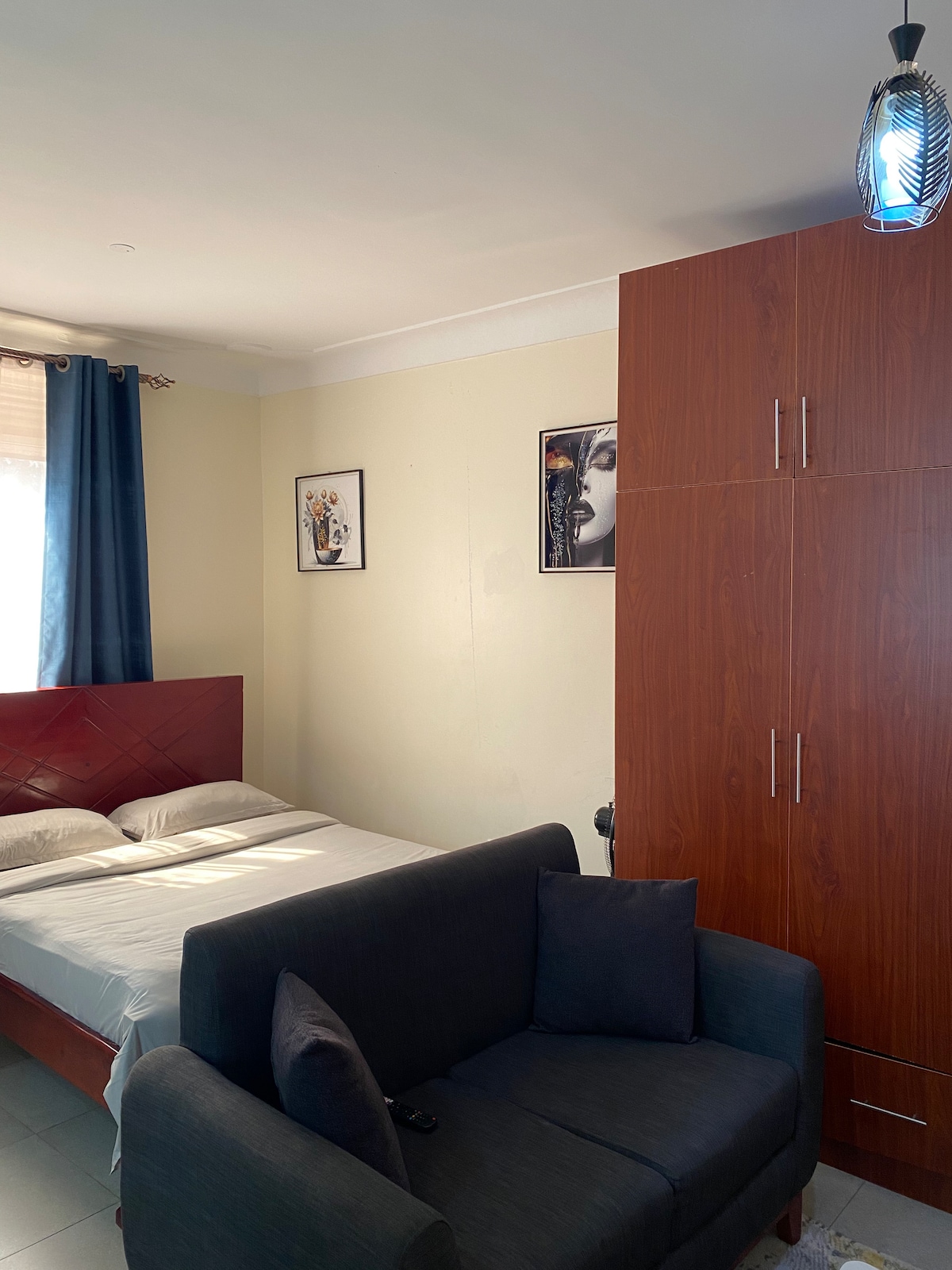 Fully furnished, self catering, contemporary studio apartment located in a wonderful neighborhood. The apartment features 1 bedroom, a flat screen TV, Wi-Fi, washing machine and a kitchenette. 20 minute drive to the city center, walkable distance to TMR hospital, Kampala Northern Bypass Highway, fresh produce market and Metroplex mall which houses a cinema, supermarket, financial services , restaurants and many other amenities.