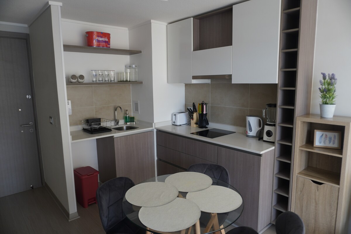 Disfruta de la sencillez de este alojamiento tranquilo y céntrico.Disfruta una estadía moderna en un edificio nuevo en el corazón de Ñuñoa, al lado del Parque Bustamante y a pasos del Metro Irarrázabal . Cuenta con: 1 Dormitorio con cama doble y sofá cama. 2 Cocina full equipada con cafetera Nespresso 3 Baño con tina y amenities. 4 Smart TV con Netflix. 5 WiFi flash de 600 Mbps. 6 Refrigerador moderno. 7 Ropa de cama premium. Fumar solo en terraza (Ley 20.660).
