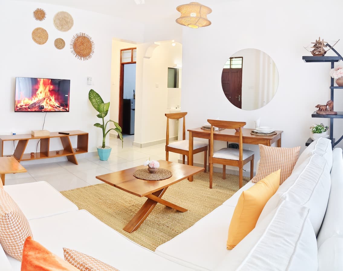 Acogedor apartamento estudio con servicios (Bamburi) amueblado. * Adecuado para 2 adultos y 1 niño o 3 adultos, amueblado con una cama tamaño queen y una cama individual. * Incluye aseo diario. * Mesa de comedor con cuatro sillas, sofá, mesa de centro. * Aire acondicionado *TV * Caja fuerte con llave * Balcón con dos sillas y mesa de centro * Cocina: nevera, microondas, hervidor de agua, cafetera, tostadora, vajilla y cubiertos. * Acceso a servicios: piscina, zona de juegos para niños, bar de playa, restaurante, gimnasio, playa, lavandería. * A 21 km del aeropuerto internacional de Moi. * A 26 km de SGR Mombasa.