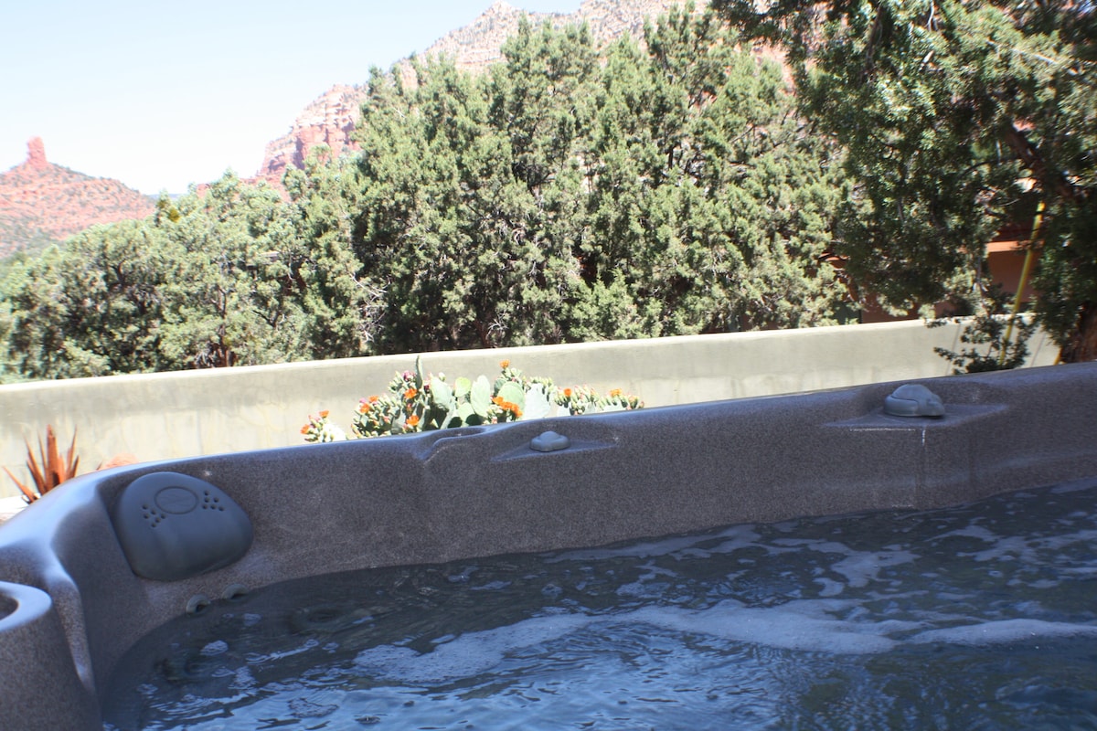 Hermosa casa remodelada de West Sedona situada en privado en un cinturón verde con muchos árboles grandes. Vistas de postal de Cathedral Rock. A poca distancia a pie de galerías, restaurantes, etc. Bañera de hidromasaje con vista al cielo abierto, chimenea. Gran terraza con vistas. Privado, pero a pocos minutos de la carretera principal y de las rutas de senderismo. Hay una cámara exterior frente a la entrada y la pasarela delantera. Hay disponibles Jeeps baratos con un 70 % de descuento. Ponte en contacto con nosotros para obtener información. Los Jeeps son una forma estupenda de ver Sedona. LIC. TPT: 21152092