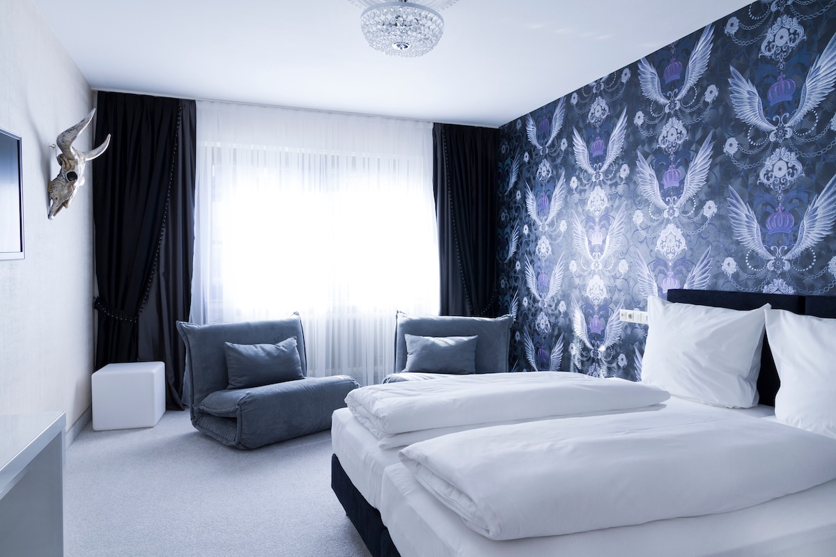 21 m² double room with modern design, cozy furnishings, and a bright, contemporary bathroom. Overnight stay includes breakfast, free use of the sport & spa area with sauna, steam bath, infrared cabin, fitness and relaxation room, plus free Wi-Fi throughout the hotel.