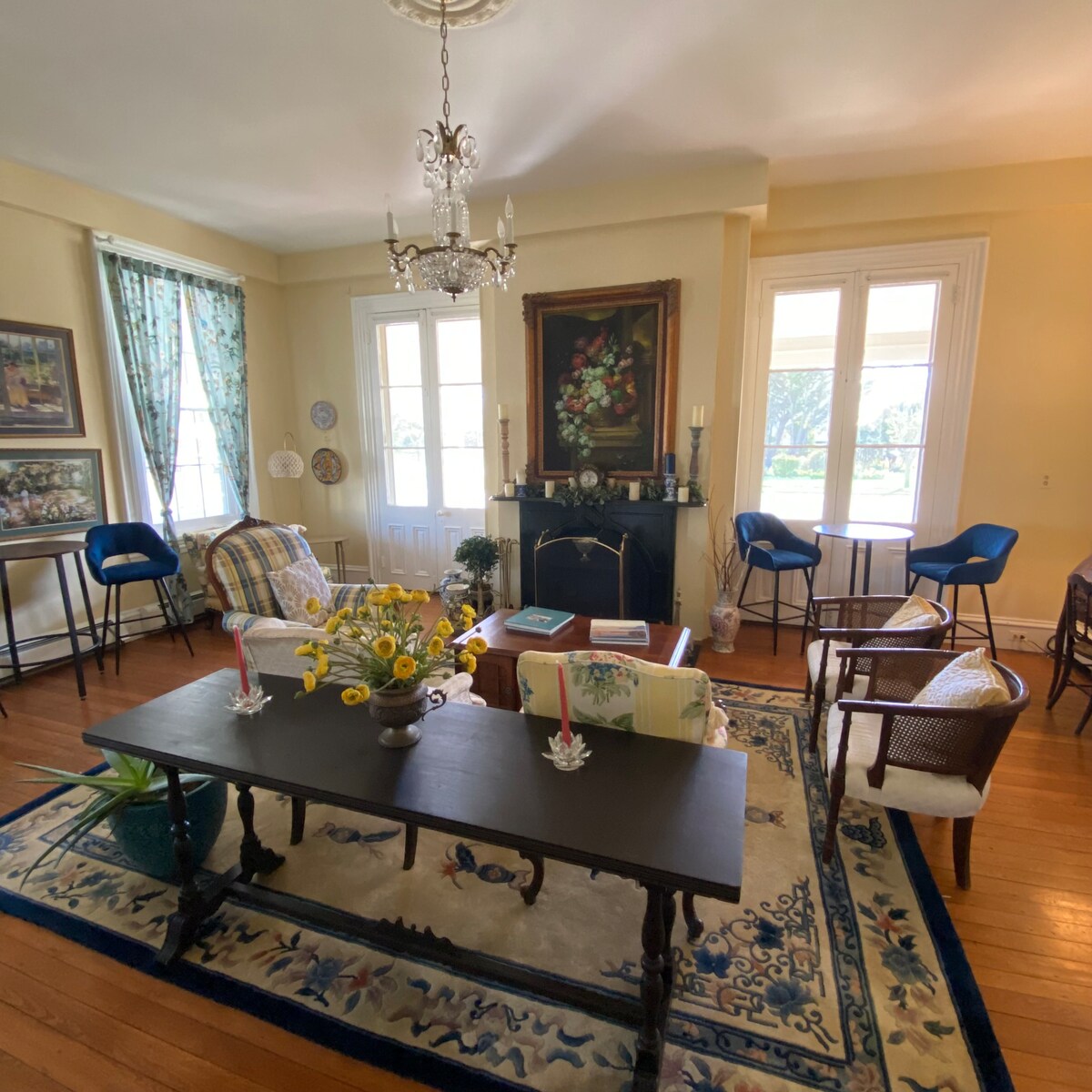 Our recently renovated Kitchenette King Room is ideal for up to two guests. This accommodation is located in our Historic Chateau Villa and features a fully equipped kitchen including a compact refrigerator, microwave, coffee machine, dishwasher, all utensils, as well as a furnished private porch (5 steps up) with a private outdoor entrance. In-season beach passes are included. Daily maid service is available upon request. Six-night minimum stay required.