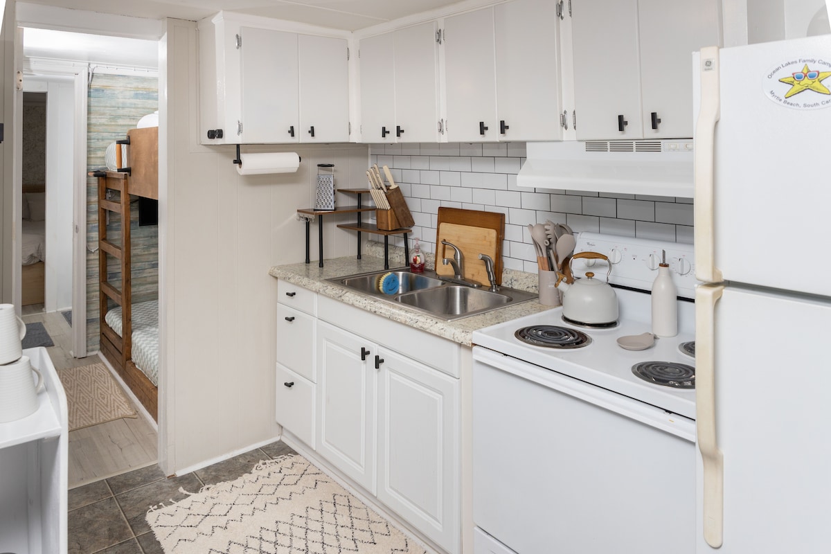 Le damos la bienvenida a Beach Times & Tan Lines ¡Sol, arena y placeres sencillos junto al mar! ¡Te damos la bienvenida a tu lugar feliz! Beach Times & Tan Lines es una divertida y relajante cabaña de playa de 2 dormitorios y 2 baños ubicada dentro del galardonado camping familiar Ocean Lakes en Myrtle Beach. Diseñado para días soleados y noches tranquilas, este refugio costero es perfecto para familias, parejas o grupos pequeños que deseen relajarse, explorar y crear recuerdos inolvidables.