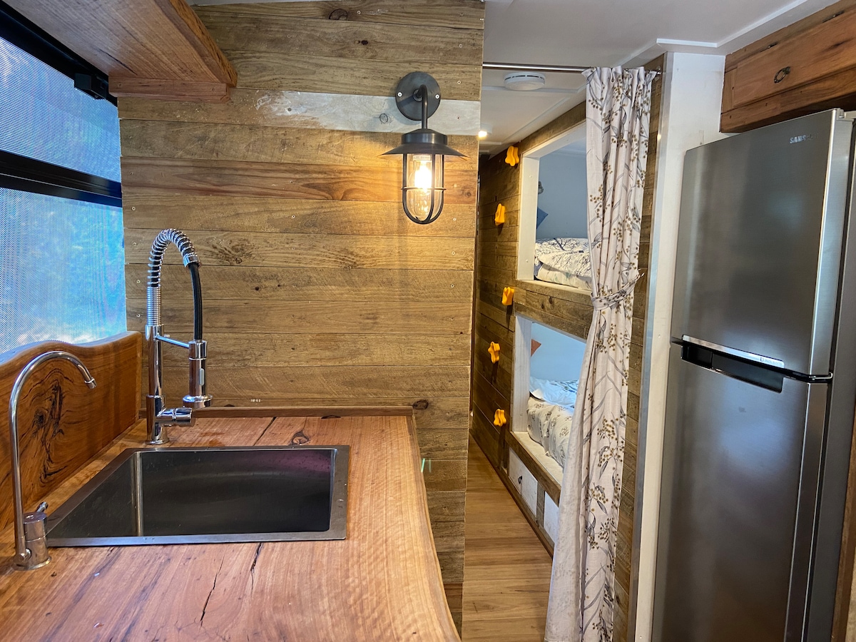 ¡Este autobús es lo más parecido a dormir en los árboles que conseguirás! Fogata de leña para mantenerte tostado. Diseñado para una pareja, pero si deseas traer a los niños que quieren acurrucarse en un sofá cama, la oportunidad está ahí. Hay un baño de leña para dos si deseas aprovechar esta oportunidad por un cargo ADICIONAL que incluye una bandeja de vino y queso, toallas, batas y gorros. ¡Los huéspedes dicen que es el mejor baño que han tenido! Muy único, incluso tiene wifi, Netflix y Chill.