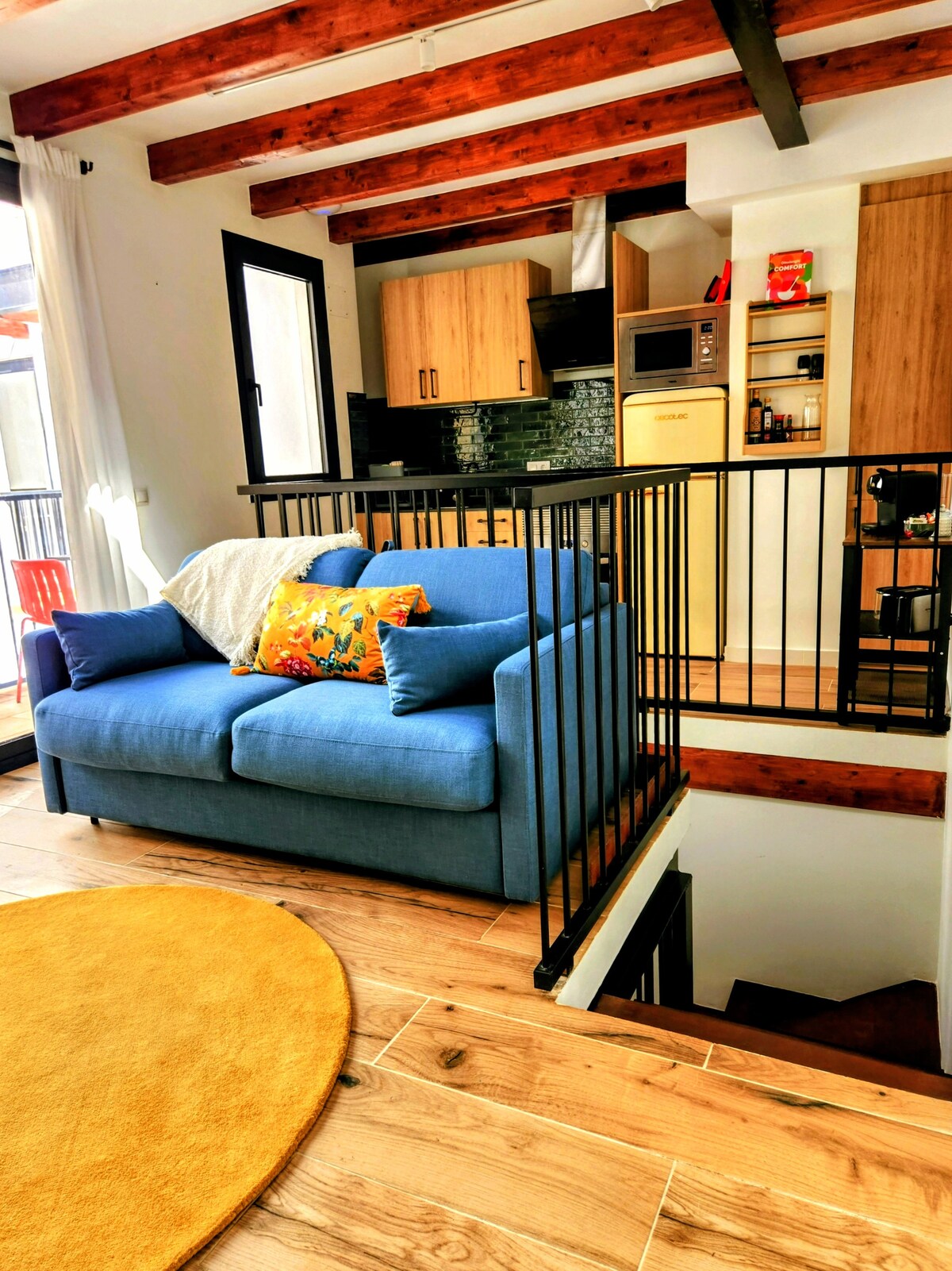 BUBU 2 es un LOFT DUPLEX situado en el corazón del centro histórico de Valencia, junto al Mercado Central y la Plaza Redonda. Ubicado en un antiguo edificio totalmente rehabilitado, su estructura de techos altos, vigas de madera, balcón luminoso con muebles de jardín y estructuras de hierro le dan un look industrial que nos hace recordar a la estética de los antiguos lofts de NYC. Este duplex de concepto abierto hará que te den ganas de quedarte a vivir en él.