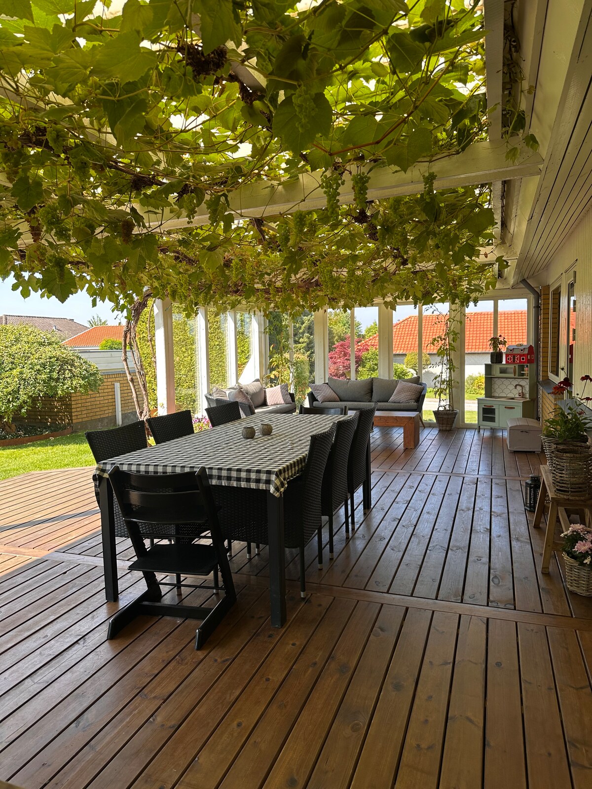 OBS! Huset er ikke blevet sat ordentligt op til udlejning herinde og der mangler bl.a. en masse billeder. Vi lejer primært gæsteværelse i underetagen ud. Men du er velkommen til at skrive, hvis det har din interesse. Familievenlig villa i tre plan med 8-9 sovepladser + 2 opredninger. 3 badeværelser, stort køkken-alrum, legeværelse, træningsrum og vaskefaciliteter. Have med gynger, rutsjebane, trampolin, sandkasse og solrig terrasse. Tæt på bus, legeplads, skov og å.