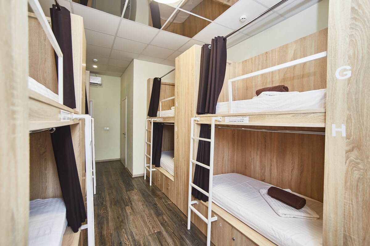 The double room is located in Le Rêve city hostel in the very center of Odessa. The room has a double bed, bedside tables, a hanger, a table on wheels, a TV