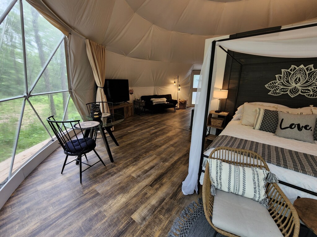 The Eclipse Glamping Dome is the perfect getaway to experience nature with all the luxurious amenities. - Open year-round—heat & AC - Located on 7 secluded acres - Direct access to the Mohican River - Private hot tub - Fully furnished patio with fire pit - Fully equipped kitchenette - Projector with Roku for streaming - CellularWIFI - Luxury bathroom - Scenic views of the forest and river - Paved parking area - 1.6 miles from the Bridge of Dreams/Mohican Valley Trail