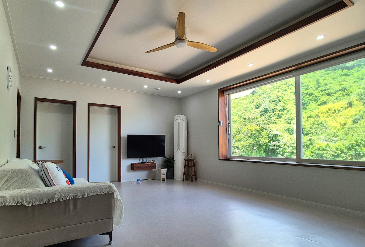 Es una casa de campo con varios árboles frutales ubicada a una altura de 420 m bajo el Samdobong de la Montaña Democrática, lejos de las bulliciosas atracciones turísticas del Parque Nacional Deokyusan y Muju Resort. Se tarda unos 10 minutos en llegar a Taekwondo Won y Bandiland, y 25 minutos en llegar a Deokyusan Muju Resort. En el interior del pueblo, también puedes disfrutar de la belleza natural del valle. Uncle House es el edificio de estructura de madera de estilo americano más aislado diseñado y construido por la prestigiosa empresa de construcción de madera de Seúl. El techo es alto, el verano es fresco y el invierno es una casa cálida, una vista alta y amplia, y un lugar caliente para disfrutar de la chimenea con vistas a las estrellas. El primer piso es el espacio de la pareja de anfitriones, y los 56 m2 (incluida la terraza) en el segundo piso es la casa de huéspedes. Tiene una entrada independiente y no es una casa incómoda porque hay un anfitrión, pero es más apreciada porque puedes obtener ayuda y servicio inmediatos. Uncle Style BBQ es un gran lugar para una familia estadounidense, y las habilidades gastronómicas acompañadas por la casa del tío son muy talentosas. El solárium con una chimenea privada al aire libre es por mucho el mejor. ♡