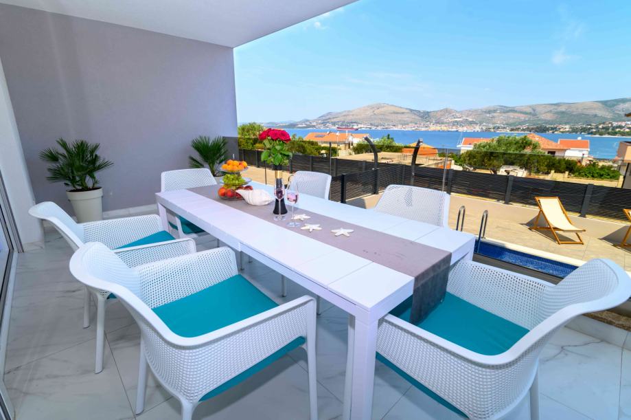 Modern apartment with panoramic views. The apartment is well equipped and has everything you need for a relaxing holiday. It is located on the island of Čiovo, near Trogir, just 10 km from Split Airport. The apartment has 3 bedrooms for 6 people, 2 bathrooms plus an extra toilet, and an open-plan living room/kitchen with access to a terrace with a dining area. There is also a large rooftop terrace with lounge furniture and fantastic views. In addition, there is a lovely pool and sun loungers.