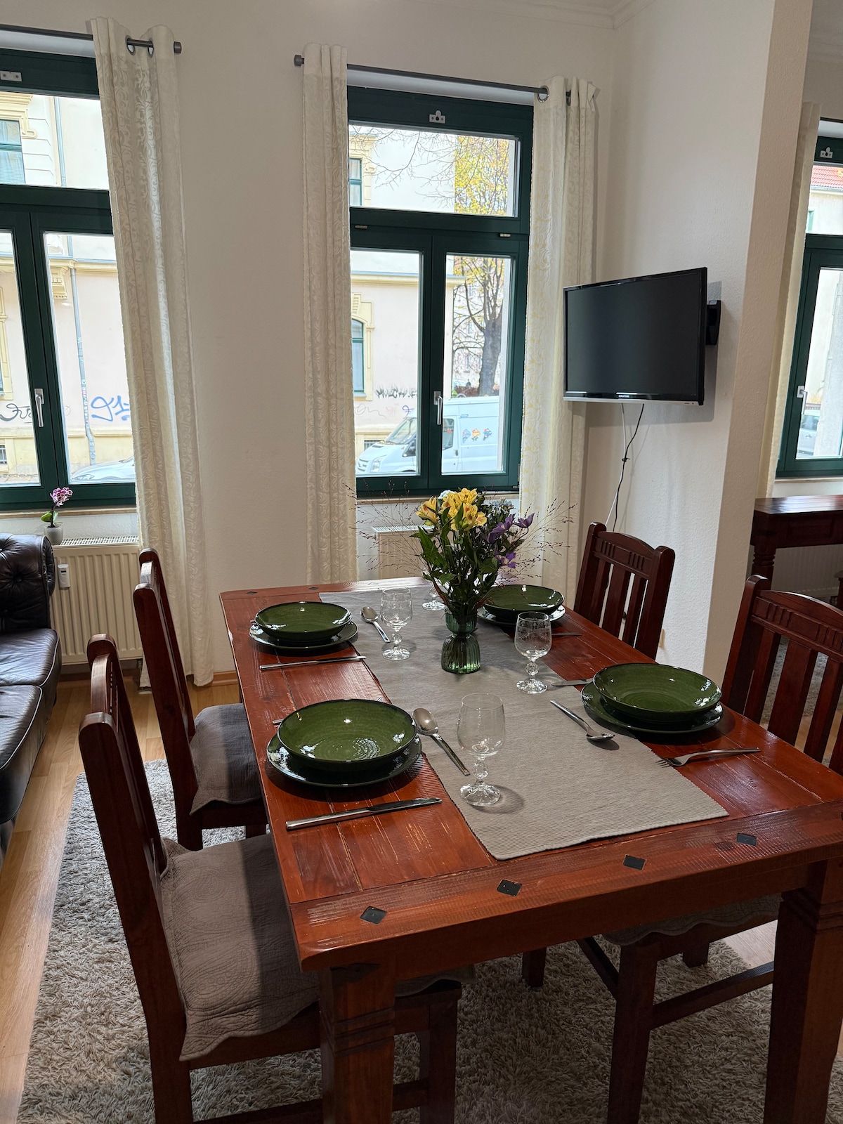 ¡Sean nuestros huéspedes! Ofrecemos alojamiento para hasta 5 personas en un apartamento independiente en una villa histórica con una gran terraza y jardín. La ubicación es céntrica en el distrito de Lindenau y bien comunicada con el transporte público. En la calle tenemos una pequeña tienda de vinos. Allí también será bienvenido, al igual que en nuestro apartamento de invitados. Estaremos encantados de darle consejos y recomendaciones sobre nuestra ciudad con una copa de vino. ¡Esperamos contar con su presencia!