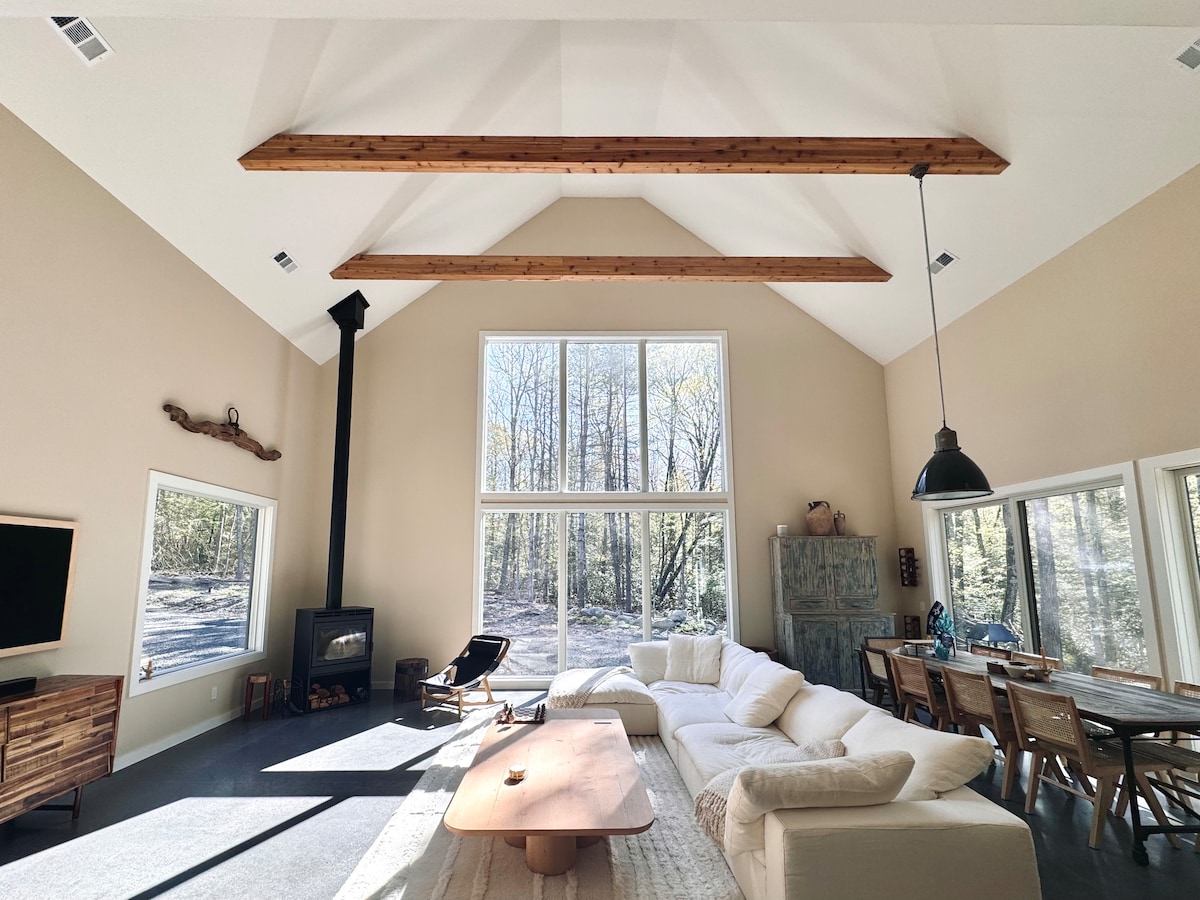 Mira desde la lujosa bañera de hidromasaje en el oasis campestre en la cima de una colina ondulante en el borde de tierras forestales con aroma a abeto. Vuelve a casa después de una caminata, una visita a una granja o un restaurante galardonado, y acurrúcate junto al fuego bajo los grandes techos de la catedral. En verano, nada en la piscina de agua salada y disfruta de la fogata rodeada de exuberantes jardines y tranquilidad. Impresionantes vistas a medida que cambian las estaciones, las ventanas muestran colinas nevadas o los vibrantes colores de las hojas de otoño que trepan por las montañas.
